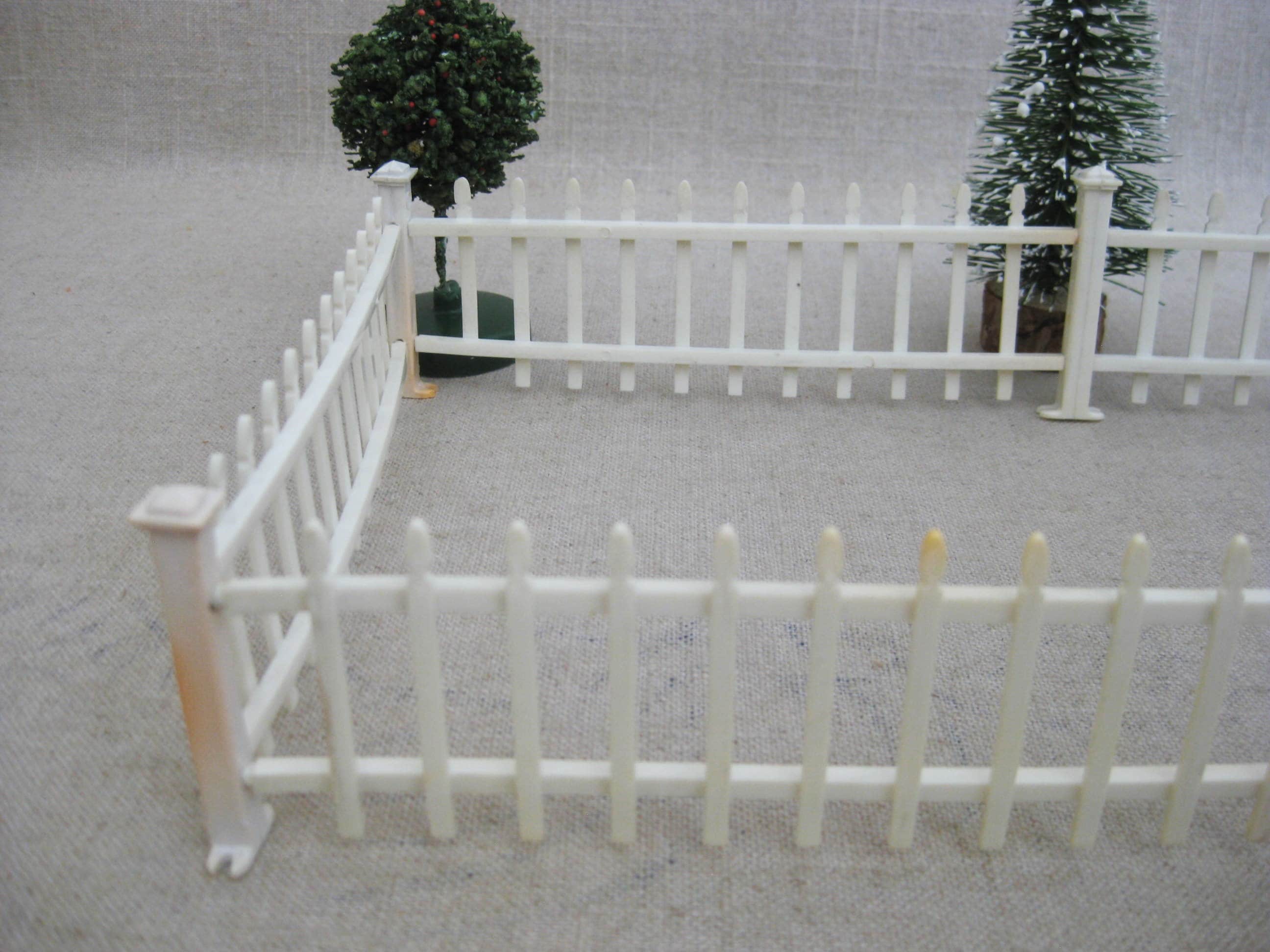 *Terrific run of Vintage Dollhouse White Picket Fence. Mid-Century Miniature Doll Size Miniature Fence "Snaps" together, with Post and Fence Strips, as shown in photos. Perfect for everything from the Dollhouse to a Christmas Village. Trees are NOT included, but may be available in my shop, please inquire.
