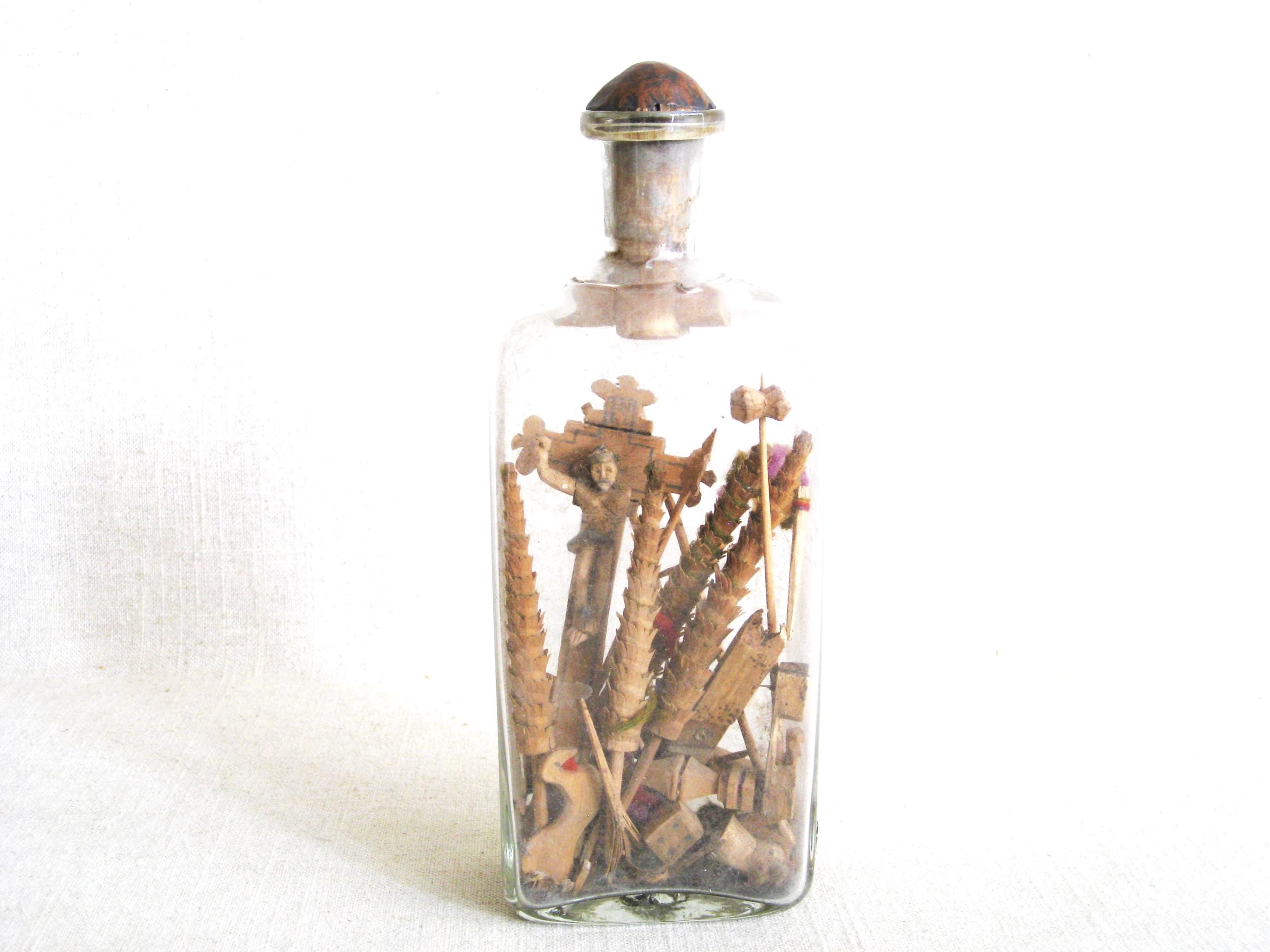 *Fascinating Vintage Folk Art Bottle Whimsey. Antique Religious Tramp Art / Outsider Sculpture, handmade, much like building a Ship in a Bottle. Maker would carve and shape his / her components then carefully create the assemblage inside using small tools.