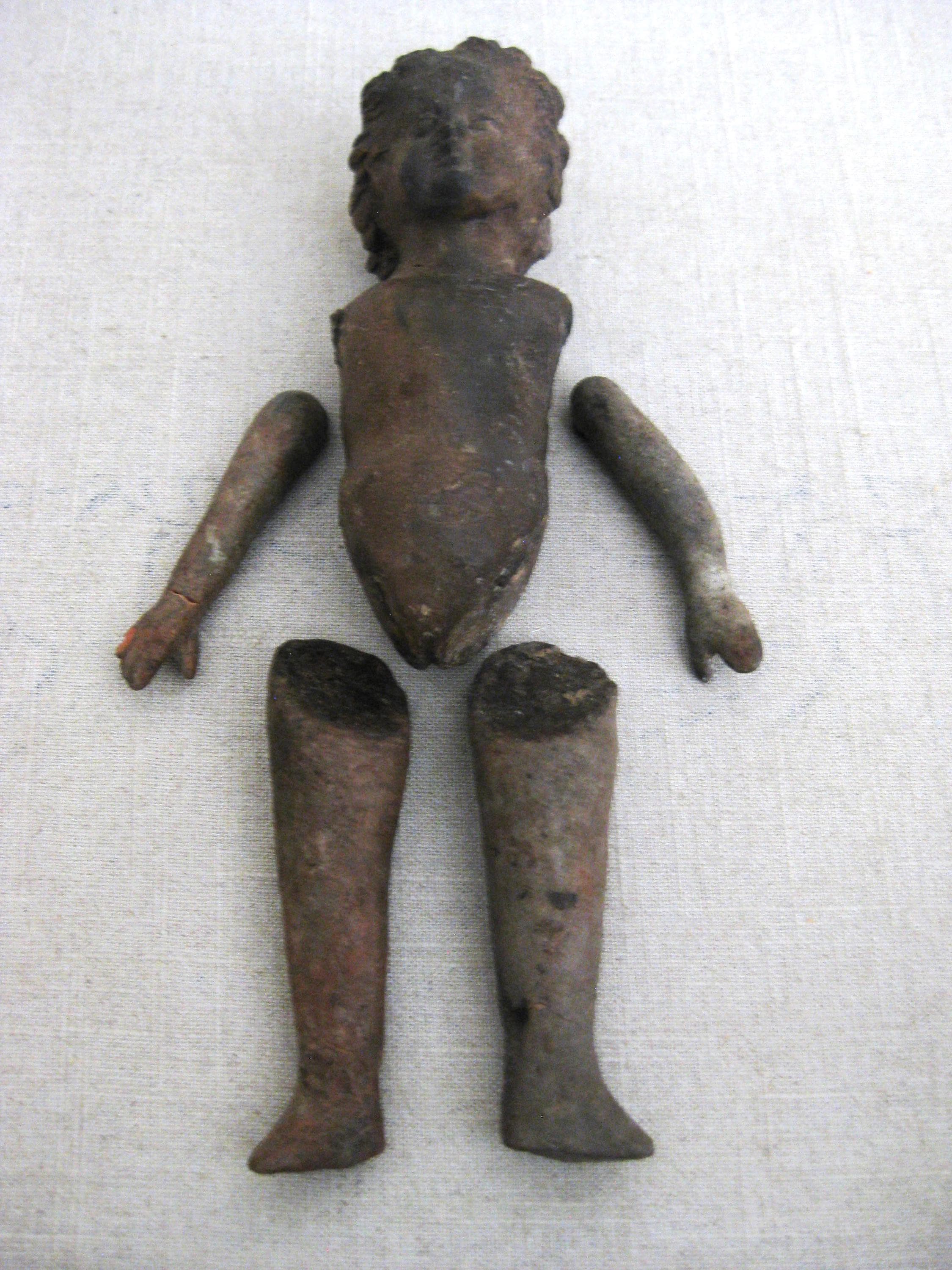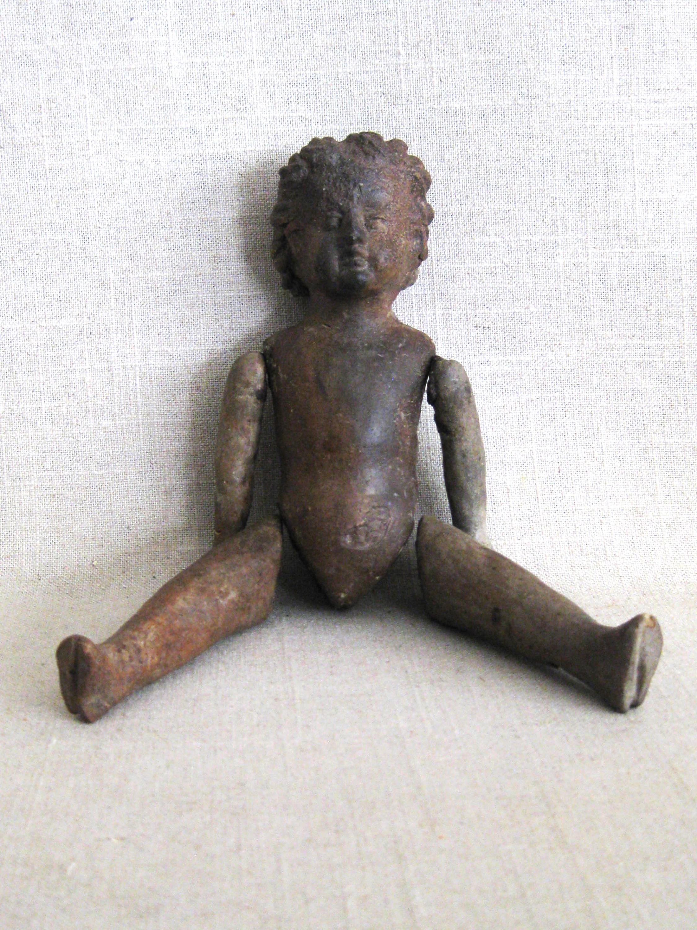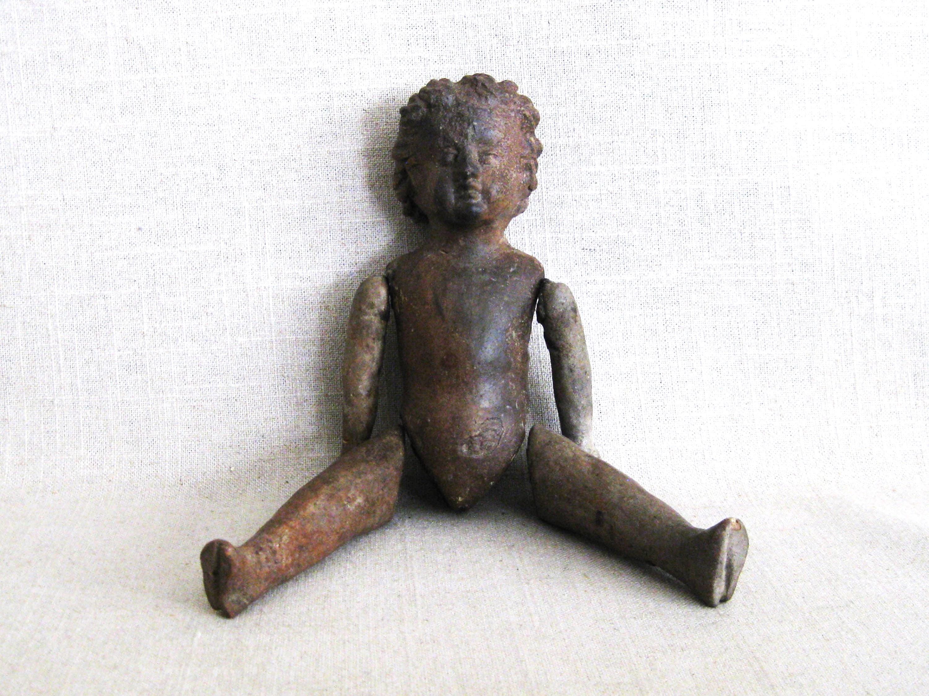 *Enchanting Antique Mexican terracotta Doll / Figure Ceramic Figurine, with articulated limbs, though limbs are Not attached. It looks as if they have only ever been, *Perhaps "Waxed" together, as residue present suggest. Some research resulted, it is likely this is a mold from which other dolls were made, which seems probable as there are incised grooves and holes, suggesting mold like details. As a Primitive Folk Art Sculpture it is fantastic, with an exceptional "Ancient" like patina. Appealing in their oddity and unique quirkiness.