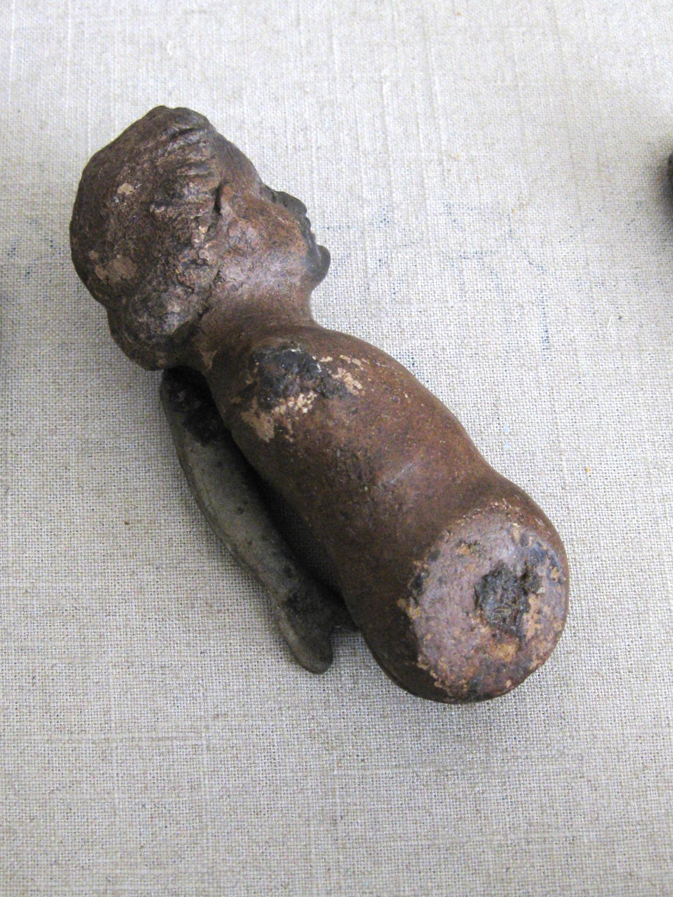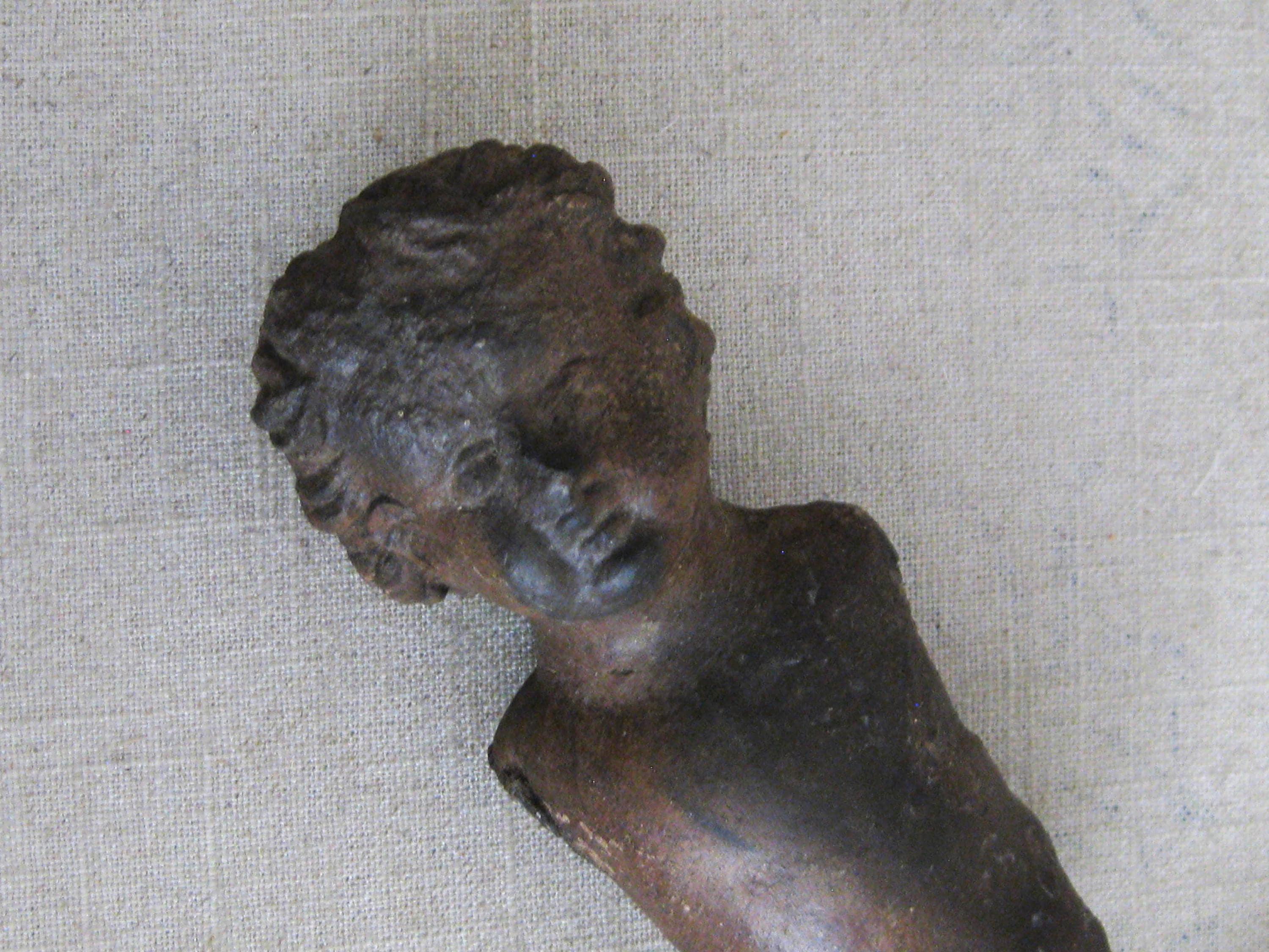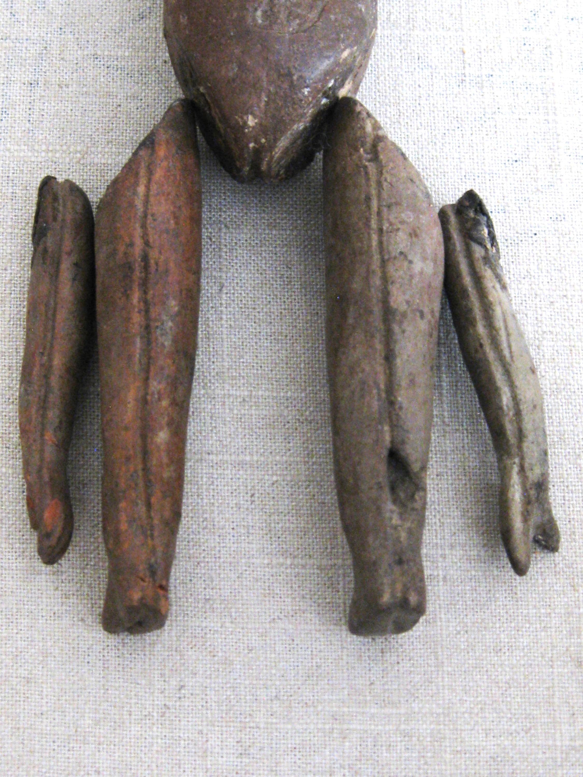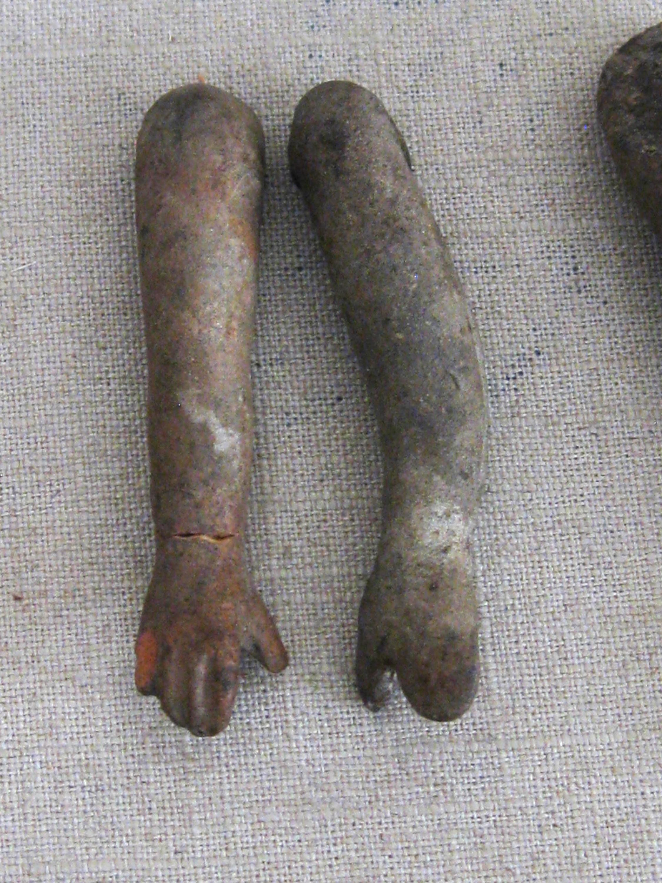 *Enchanting Antique Mexican terracotta Doll / Figure Ceramic Figurine, with articulated limbs, though limbs are Not attached. It looks as if they have only ever been, *Perhaps "Waxed" together, as residue present suggest. Some research resulted, it is likely this is a mold from which other dolls were made, which seems probable as there are incised grooves and holes, suggesting mold like details. As a Primitive Folk Art Sculpture it is fantastic, with an exceptional "Ancient" like patina. Appealing in their oddity and unique quirkiness.