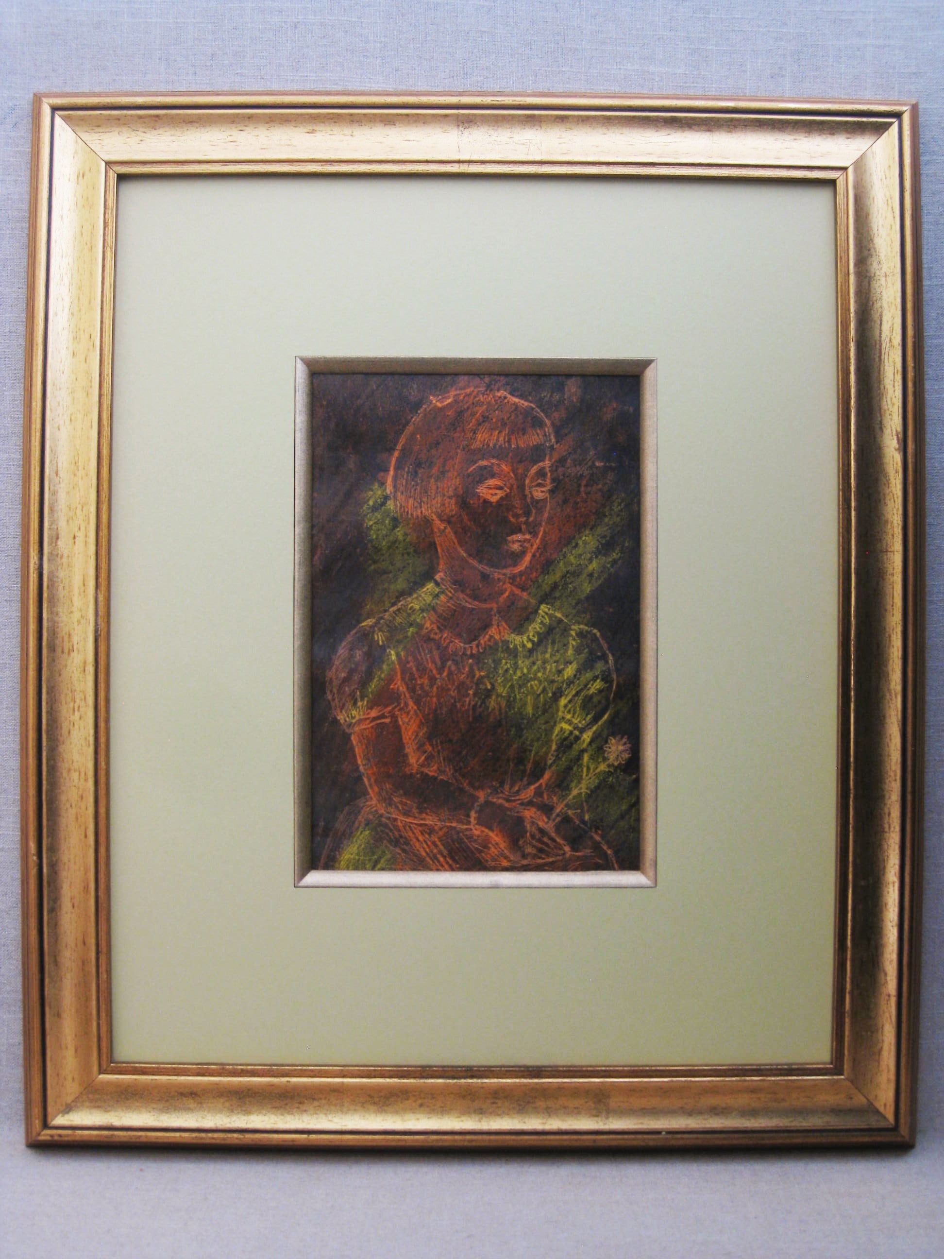 *Terrific Vintage Female Portrait "Drawing" by Hilda Wilson. Female portrait by Hilda Wilson in the late 50's, during her days at the School of the Art Institute, Chicago, prior to marriage, later works are identified as Hilda Bourgeois and Hilda Bourgeois Daly. Original Fine Art Drawing done by coloring the paper with oil pastels, then scratching the surface to "Draw" the figure. Framed in a large "gilt" style frame surrounded by a wide profile soft Celadon Green mat. Mat is definitely soft green, though a bit difficult to get an actual coloration in the photos. Not signed, but was included in a portfolio of works from the artist studio in the Chicago area.